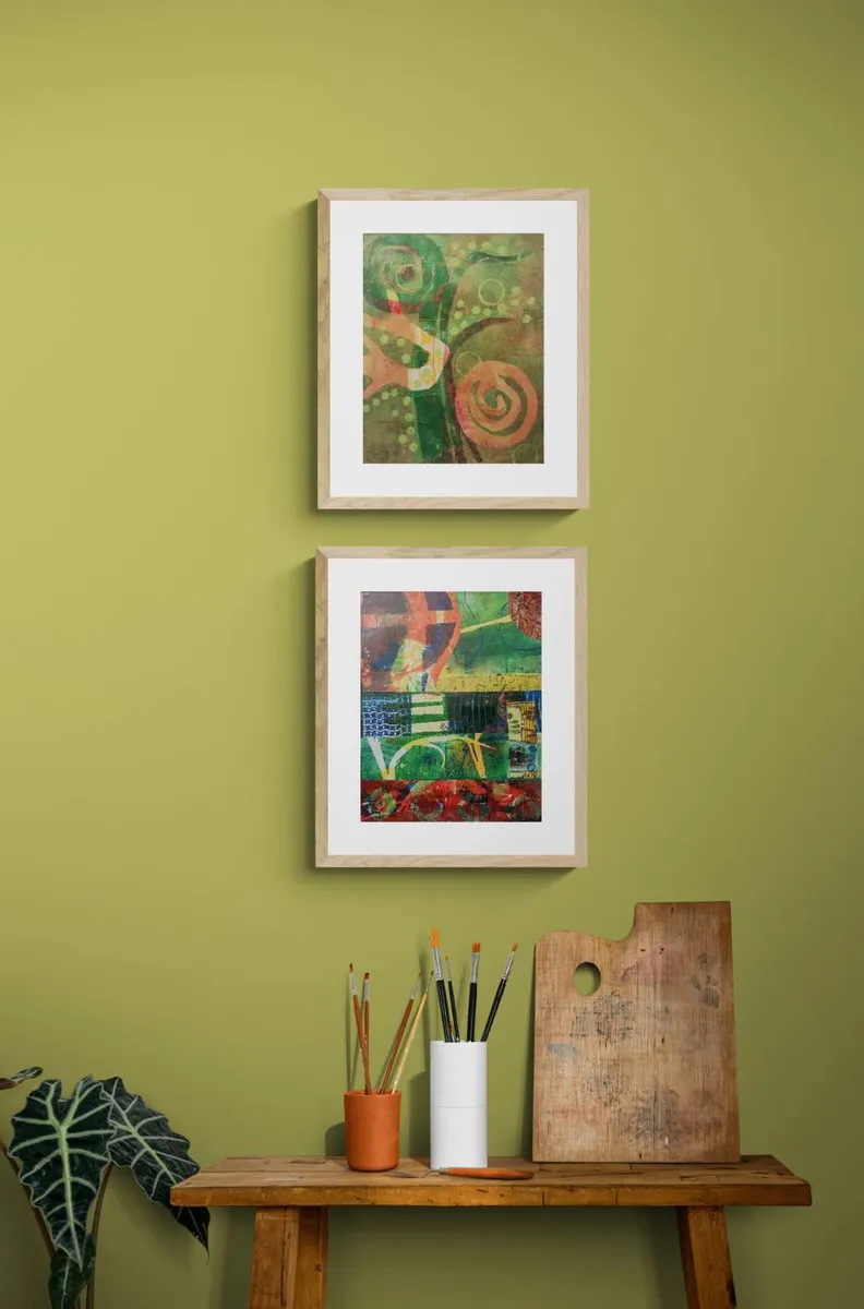 Original playful collage of acrylic prints in shades of violet, green and blue. My prints are made with the GICLEE process giving ultra-detailed image resolution and vibrant colors on premium paper.