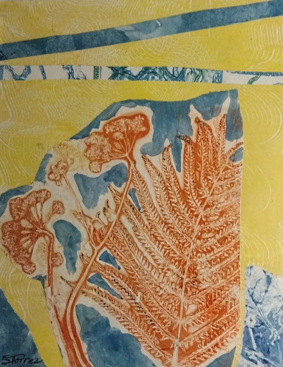 Original collage with acrylic printed papers showing botanical elements in yellow, blue and white. My prints are made with the GICLEE process giving ultra-detailed image resolution and vibrant colors on premium paper.