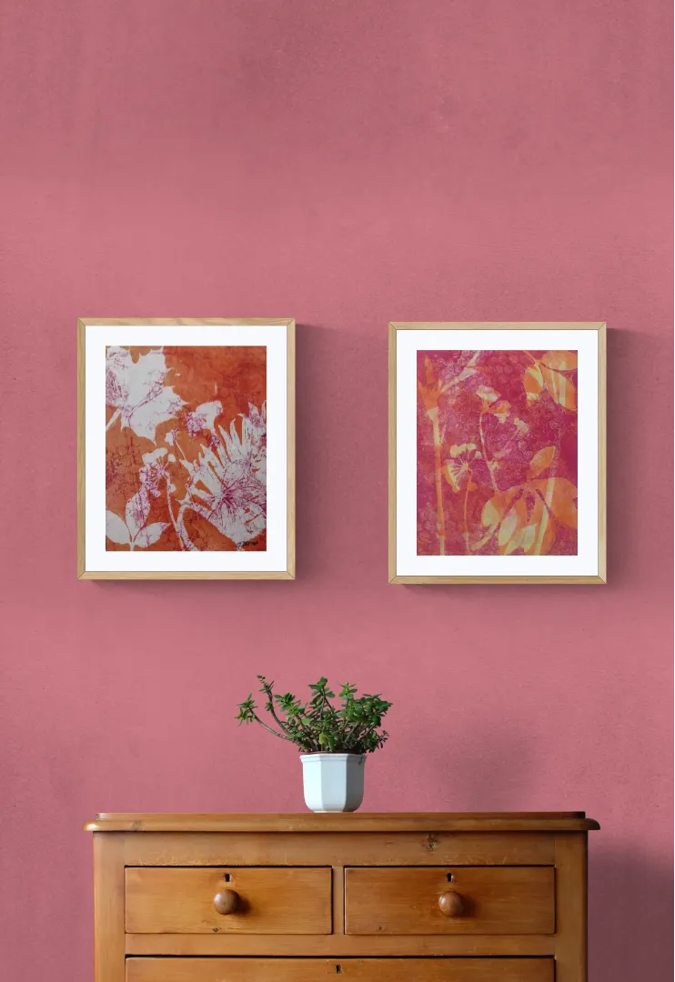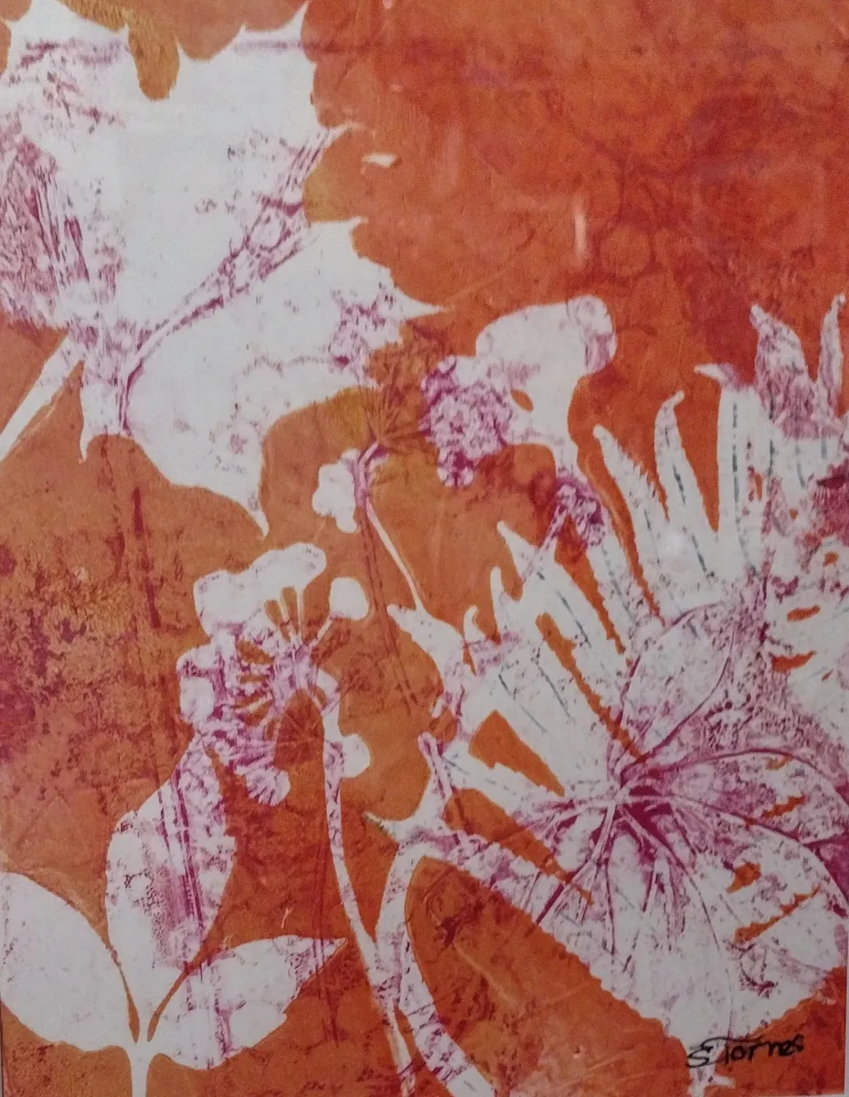 Original artwork. Layered acrylic print of leaves and flowers in bright pink, orange, and white. Layering different colors and shapes doesn't always work as well as it does in this piece. And I love the colors! My prints are made with the GICLEE process giving ultra-detailed image resolution and vibrant colors on premium paper.