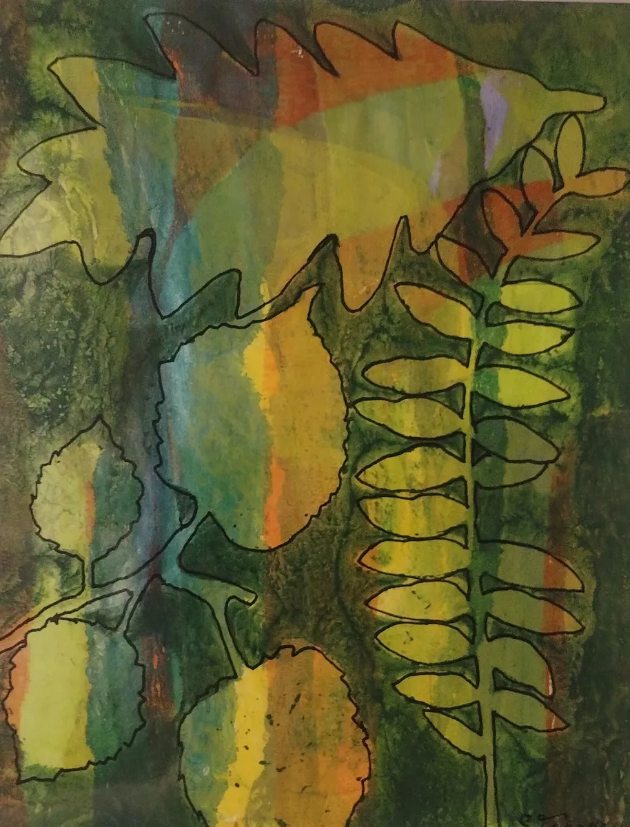Original acrylic monoprint of leaves and ferns in shades of green with subtle stripes of yellow blue and rust. Acrylic pen outlines. GICLEE process print - ultra-detailed image - vibrant colors - premium paper
