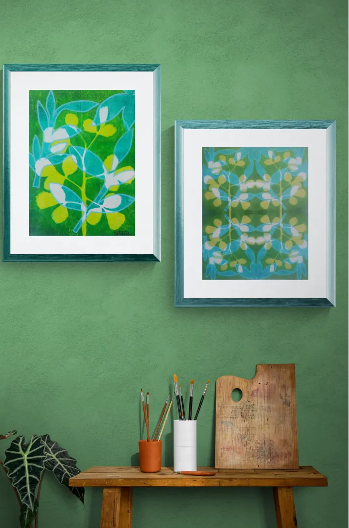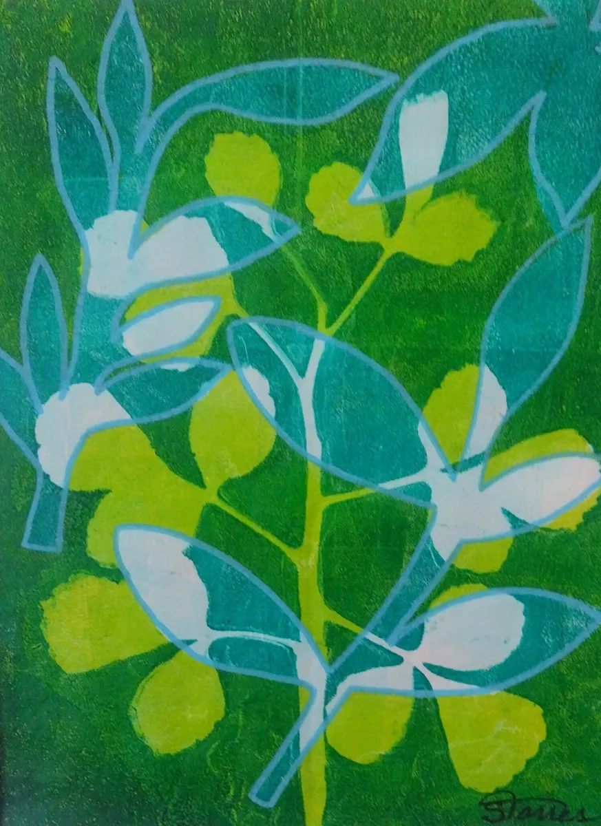This print is a juxtaposition of natural and cut-out leaves in shades of blue, teal, green, and yellow green. There is also outlining in aqua acrylic pen of the teal leaves. My prints are made with the GICLEE process giving ultra-detailed image resolution and vibrant colors on premium paper